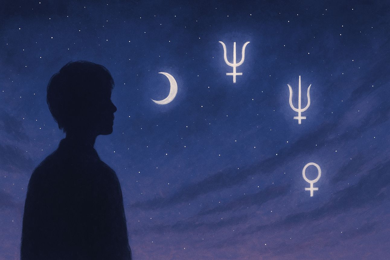 Starry night sky with glowing Mercury, Moon, Chiron, Neptune, and Uranus glyphs in a soft spiral on a deep indigo background.